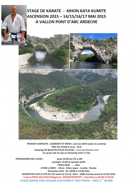 Compte tenu du succès remporté par le stage de 2014, nous renouvellerons le stage d'Ardèche à Vallon Pont D'Arc. La date choisie sera celle du week end de l'Ascension, comme l'année dernière, c'est à dire les 14, 15, 16 et 17 mai 2015.
